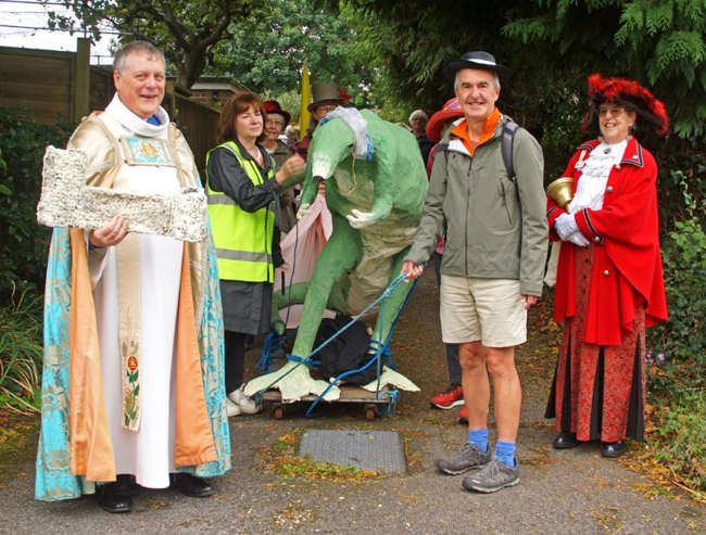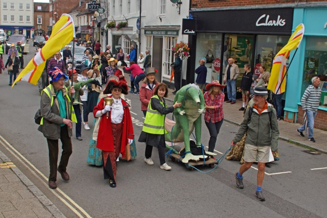 | THE GRAND PROCESSION AHEAD OF THE WIMBORNE MINSTER FLOWER FESTIVAL The grand procession of the accessories used in the Wimborne Minster Flower Festival duly took place as planned through the Streets of Wimborne Minster on the morning of Saturday 20th September. The helpers started to gather at the home of Anthony & Christine Oliver in Park Lane, Wimborne Minster from 9.30am in readiness to carry all the accessories which have been made out of papier mache over the last year to the Minster in readiness for the Flower Festival which opened on Friday 26th September and continued until Monday 29th September. Entry to the Festival was £7.50 with all proceeds going towards the proposed ramp and improved steps to make the historic church readily accessible to everyone. The Parade was led by the Rector of Wimborne Minster The Revd Canon Andrew Rowland and the Assistant Curate the Revd Marianne Mangham together with the Town Crier of Wareham Jacqui Hall standing in for Wimborne's Town Crier Chris Brown. The route took the procession through Willow Walk as the Wimborne Food Festival was setting up and on through the Hanham Road South Car Park up Mill Lane and into the High Street and onto the Minster. "There were plenty of onlookers who, I think were most amused by what they were seeing especially the Dinosaur", said Anthony Oliver, the Minsters Press Officer who also headed the Parade carrying the Dorset Flag. Revd Marianne also carried aloft the Dorset Flag. Christine Oliver who designed the whole festival which has the title of "The Delights of Dorset" said "that she was grateful for all the help and support she has received from many volunteers over the past year in helping to make the accessories and to the many Flower Clubs from across Dorset and our own team of Flower Arrangers who staged the Exhibits in the Minster. The whole Festival could not be done without everyone's support and now all we want is the Public to come and enjoy the event". |